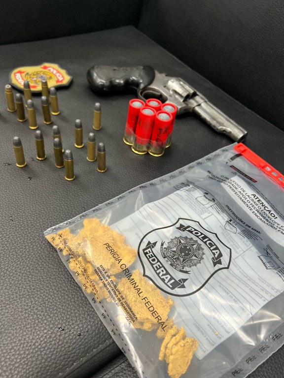 During or cumbrimento do commanded, the police federais localize approximately dois thousand liters of combustions in an irregular way, near meio quilo de ouro, um revolver com numeração suppressed, alm of various munições.